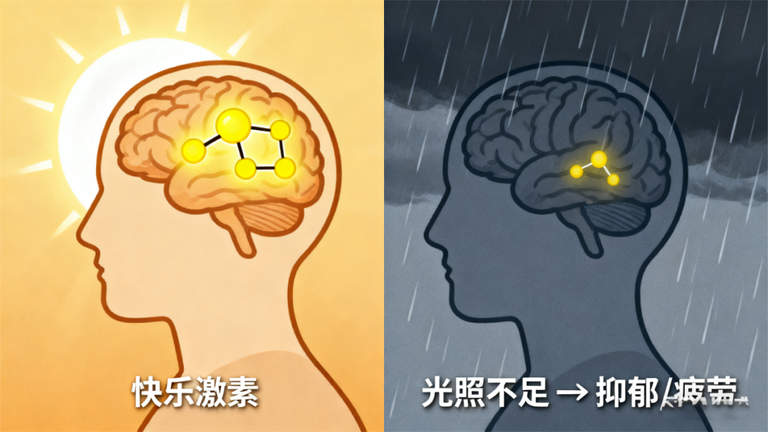 阳光能刺激大脑分泌“快乐激素”血清素。雨天光照不足,血清素水平下降,人就容易感到抑郁、疲劳、注意力涣散。