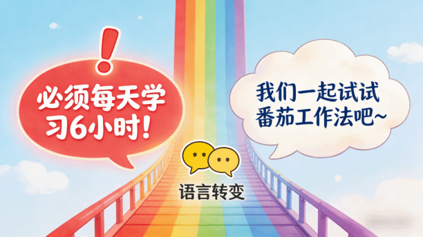 ·“你必须每天学习6小时”,换成“我们一起试试番茄工作法,学25分钟就休息5分钟,怎么样?”