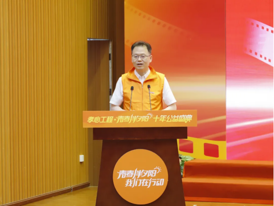 与会领导和嘉宾共同向学校代表授“青春伴夕阳”志愿者团旗,启动了新一年度“孝心工程·青春伴夕阳”活动。鲜艳的旗帜在空中飘扬,这是孝心、爱心传承,也是青春坚定的承诺。