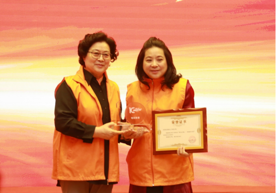 全国妇联原副主席、书记处书记、中国婚姻家庭研究会会长、中国妇女发展基金会理事长甄砚为爱心企业京都念慈菴颁发感谢奖杯和证书