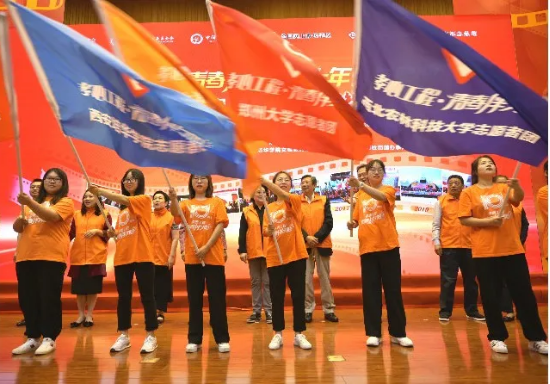与会领导和嘉宾共同向学校代表授“青春伴夕阳”志愿者团旗,并启动新一年度活动