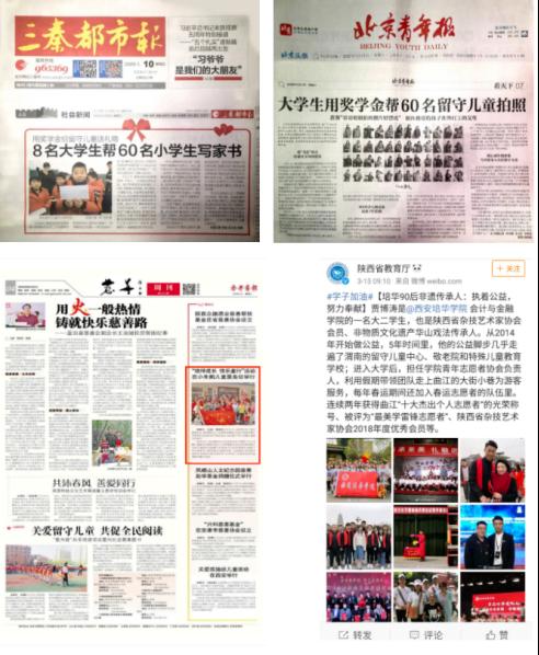 2014年,贾博涛利用周末往返于渭南和西安,来到留守儿童家园和特教学校,为近千名留守儿童、特殊儿童们表演、教授魔术。身为一名大学生,他将自己所有奖学金和积攒的生活费,全部用于为留守儿童添置衣服、购买文具、魔术道具。