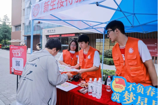 红马甲、小推车、迎新牌...,,,志愿者的身影忙碌穿梭在校园各个地方,全校上下齐动员,热情周到地迎接新同学的到来。