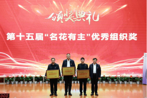 西安培华学院校长李映方为获得“第十五届名花有主优秀组织奖”的学院颁奖