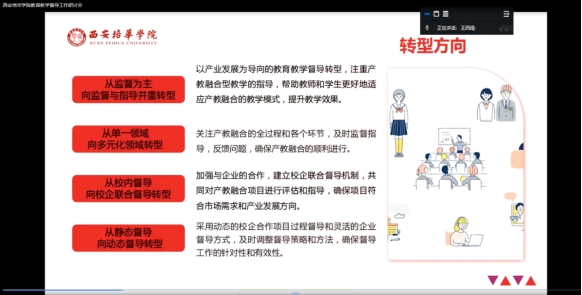 本次研讨会的主题是“深化产教融合,推动教育教学督导转型发展”。学校教育教学督导办公室主任王西娅作题为《产教深度融合背景下的教育教学督导工作转型思考》主题发言,来自质量管理部门和各学院的校院两级督导代表10人,围绕学校产教融合的“督”与“导”进行了热烈发言,提出了具体、可行的意见和建议。