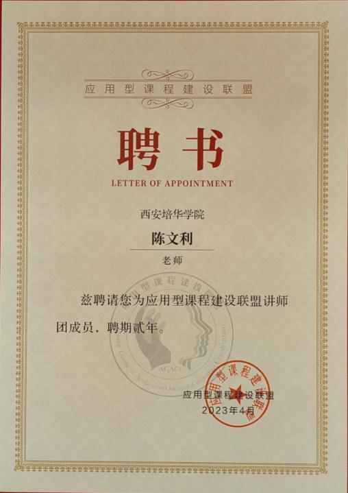 智能科学与信息工程学院老师陈文利受聘为第三批联盟讲师团成员聘书