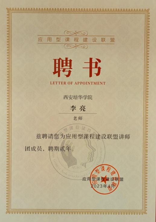医学院老师李亮受聘为第三批联盟讲师团成员聘书