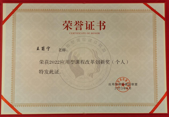 本次论坛对应用型课程改革先进团队及个人进行了表彰,其中学校医学院副院长王菊宁获得2022应用型课程改革创新奖(个人)。