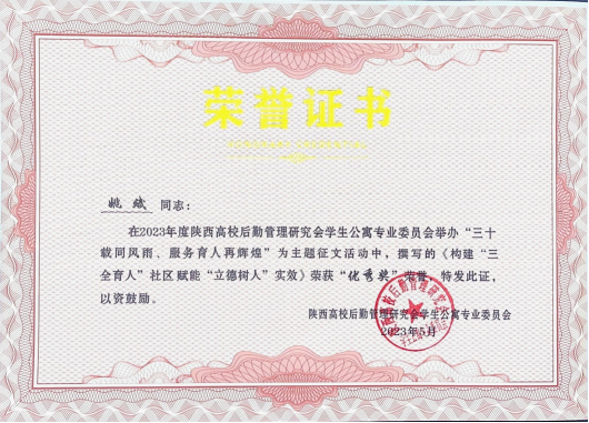 学生服务中心副主任姚斌撰写的《构建“三全育人”社区赋能“立德树人”实效》荣获征文“优秀奖”
