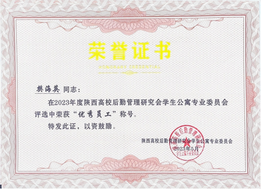 学生服务中心公寓管理负责人樊海英被评为陕西高校学生公寓“优秀员工”
