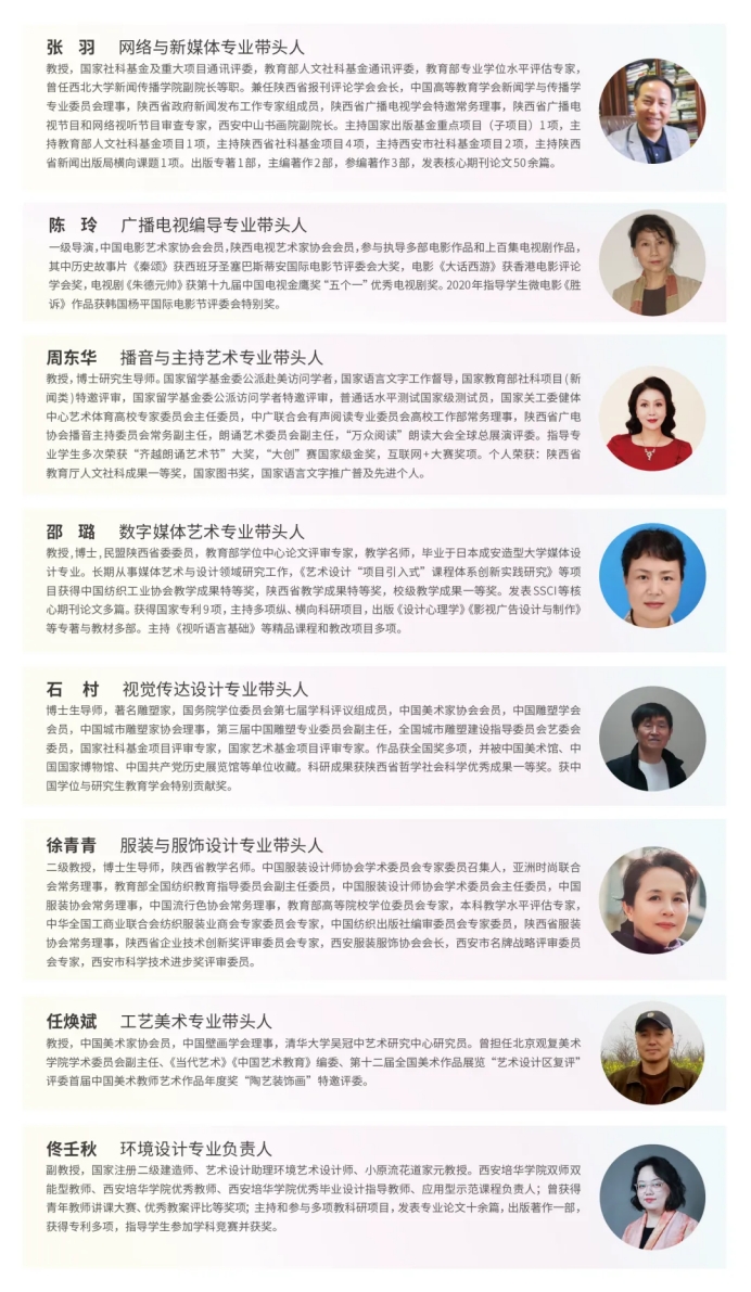 西安培华学院传媒与设计学院积极构建“传媒+艺术+技术”跨界融合的学科生态,设有网络与新媒体、广播电视编导、播音与主持艺术、数字媒体艺术、戏剧影视文学、新闻学、视觉传达设计、工艺美术、环境设计、服装与服饰设计10个本科专业,其中播音与主持艺术、网络与新媒体和视觉传达设计为校级应用型特色一流专业,形成覆盖“视听传播、数字设计、文化创意”三大领域的专业集群,近年来,学院坚持“外引内培”双轨并进,师资队伍实践经验丰富,教科研成果丰硕。