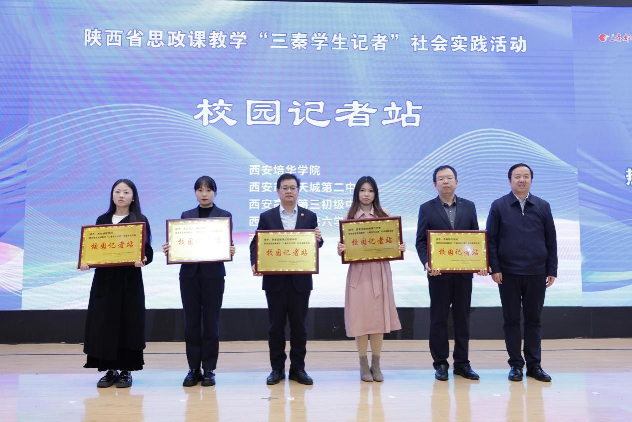 西安培华学院合作发展中心主任柳雨、传媒与设计学院常务副院长徐莹以及来自三秦都市报的嘉宾们为新一批陕西省思政课教学“三秦学生记者”社会实践活动的试点学校、示范学校、优秀合作单位、采访实践基地、校园记者站及优秀辅导员、十佳三秦学生记者等颁奖,推动“三秦学生记者”各项工作持续走深走实。其中,学校传媒与设计学院党委书记王飞代表培华领取奖牌。