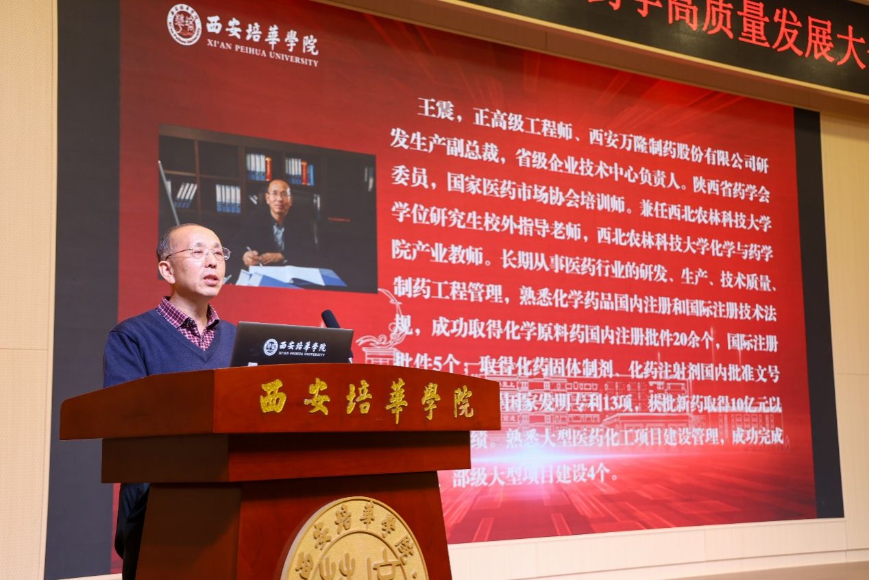 陕西省医药质量协会会长、诚域集团董事长单升高讲话。他表示,培华作为中国首批迈入百年发展历程的民办高校,在发展进程中始终展现出蓬勃活力与创新动能,成功突破了多重发展壁垒。学校与企业深度合作的开放共赢模式,既实现了校企双方的互利共生与协同发展,更为医药学专业发展构筑了优质外部环境。最后,他诚挚祝愿学校未来能持续攀登新高峰,再创发展新佳绩。