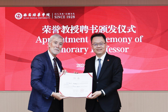 Chairman Jiang Bo presented President David Agnew with an honorary professorship certificate from Xi'an Peihua University