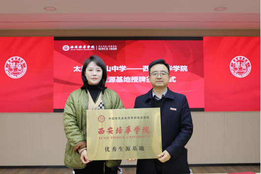 招生与就业指导中心主任姚斌与进山中学校副校长周一签订“西安培华学院优秀生源基地”协议并授牌