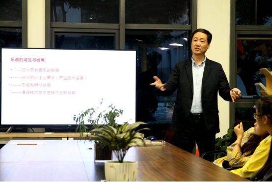 最后,刘教授还提到音乐艺术与大学生活、艺术与科学技术之间的关联性,并且例举了中外历史上著名的科学家,如钱学森、袁隆平、爱因斯坦等都是音乐爱好者,说明了艺术教育不仅能提高人们的审美情趣,还可以激发人的创新灵感。