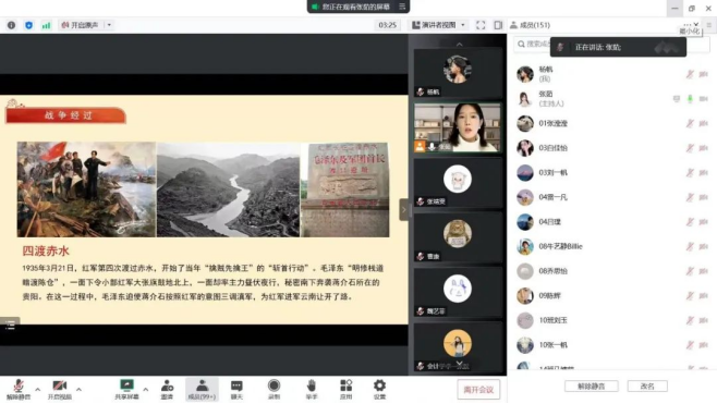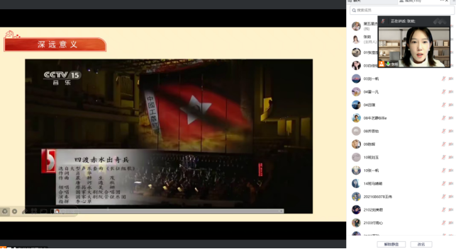 张茹老师分别从红军四渡赤水的战争概况与背景、战争经过与路线、胜利原因及意义、《四渡赤水出奇兵》歌曲内容与欣赏等四个方面给在座师生进行了分享。为了让师生能够深刻了解到《四渡赤水出奇兵》歌曲的背景,张茹老师详细讲述了红军长征时的故事。并且带给大家分享了由廖昌永、吴娜所演唱的《四渡赤水出奇兵》视频资料。