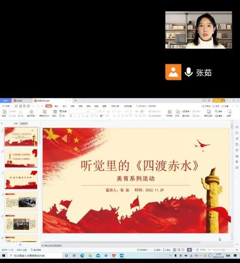 为了丰富校园文化生活,提高学生审美能力和艺术素养。2022年11月29日中午12:30,由艺术教育中心张茹老师给我们带来的“听觉里的《四渡赤水》”艺术课程思政沙龙在腾讯会议开展,艺术教育中心教师及二级学院160余名学生代表参加了此次线上沙龙讲座。