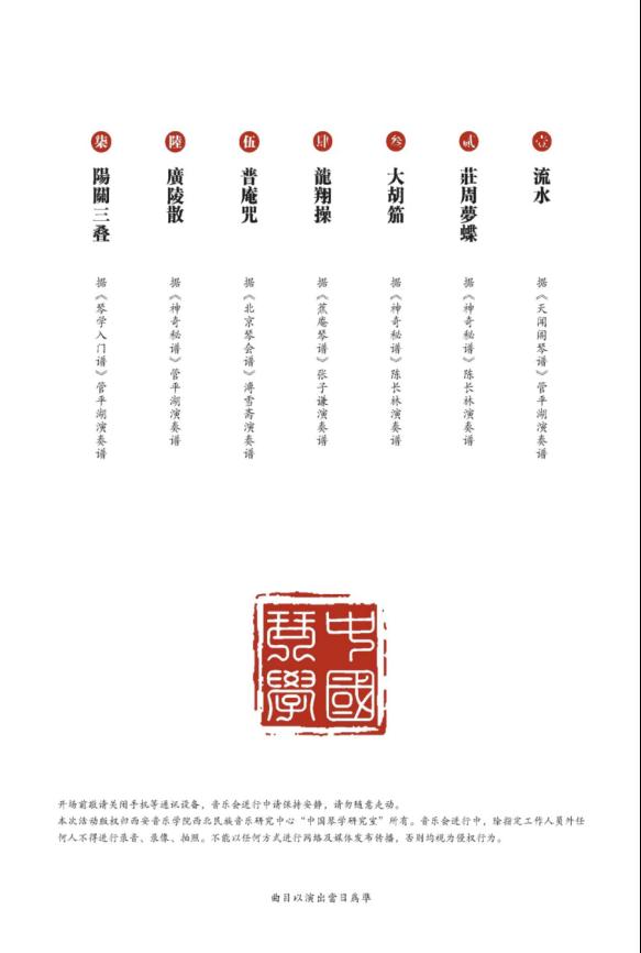 音乐会在琴曲《流水》中拉开序幕。演奏家们用精湛演奏技艺为现场观众带来了唯美的视听享受。古琴曲《庄周梦蝶》古琴悠扬,厚重而深远,抚琴者似乎透过这近乎空灵般的琴声,诠释着庄周所追求的,物我无别,生死同意的独有哲思;《大胡笳》旋律跌宕多姿,苍劲有力,运指明快,繁促泛音贯穿此曲,声声入耳,回味无穷,让观众亲眼目睹了演员们的高超琴技;《广陵散》旋律激昂、慷慨,那种愤慨不屈之气的精神从琴曲中体现。《阳关三叠》音调纯朴而富于激情,平静处如泣如诉,表达着离别的悲恻,激越处慷概激昂,给人以悲壮狂歌之感。西安音乐学院中国琴学研究室主任、艺术博物馆馆长李村教授对每一首曲目进行了深入浅出地介绍,拉近了在场观众与古琴音乐的距离。