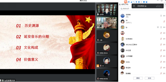 为落实美育教学,提升学生艺术审美和人文素养。2022年12月6日晚19:00, 陕西省音乐家协会党组书记吕品老师给我校师生在线上开展了一场题为《延安红色音乐的文化构成》的美育课堂,艺术教育中心教师及我校二级学院学生代表约300人共同聆听了本次线上艺术课堂。由于疫情原因,活动通过线上举办。