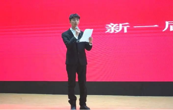 新一届学生团长郭卓逸发言,他表达了自己对于大学生艺术团的热爱,回顾了大艺团过去两年的收获,对新加入大学生艺术团的学弟学妹们提出未来一起团结互助,脚踏实地的美好期望,呼吁同学们努力为这个大家庭付出自己的一份力量,一起在大艺团用艺术书写多彩人生。