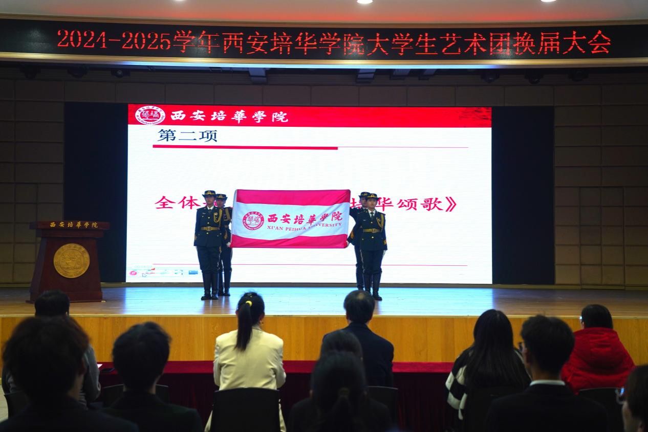 精诚所至,金石为开。换届在即,激情澎湃。2024年11月21日19:00西安培华学院大学生艺术团2024-2025学年换届大会在恒友楼四楼报告厅隆重举行。主持人首先介绍出席本次大会的领导及老师们,他们分别是艺术教育中心主任刘荣弟教授,艺术教育中心张茹老师、雷孟颖祎老师、张靖雯老师、齐堃老师、刘晗悦老师、李龙老师和宋亚平老师,以及大学生艺术团各队学生代表150余人。