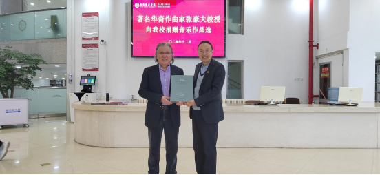 在讲座之前,张豪夫教授将自己出版的著作《张豪夫音乐作品选》(共十册)赠予我校图书馆,闵波副馆长向他颁发捐赠证书。