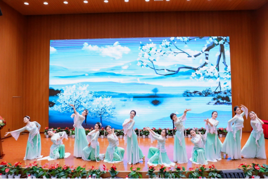 18:00,艺术教育中心师生在沁园为与会代表献上了传统与现代相结合的精彩节目。开场古典舞蹈《醉春风》通过柔美灵动的肢体语言与诗意的艺术编排,生动展现了春日万物复苏、人与自然共醉于盎然生机的东方美学意境,传递出对生命活力与传统文化精神的赞美。