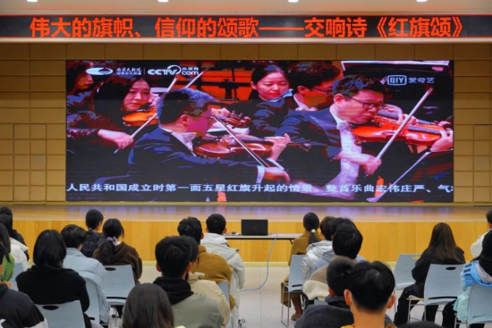 作为“七一”勋章的获得者,吕其明先生创作出了许多耳熟能详的乐曲,刘荣弟教授首先给大家分享了《啊!故乡》《弹起我的土琵琶》《谁不说俺家乡好》等作品。其次,刘教授播放了交响作品《红旗颂》,让我们感受到了交响乐的魅力,在欣赏过程中,刘荣弟教授为大家分析了乐曲的曲式结构并对整个乐曲的精神内涵进行了解读。