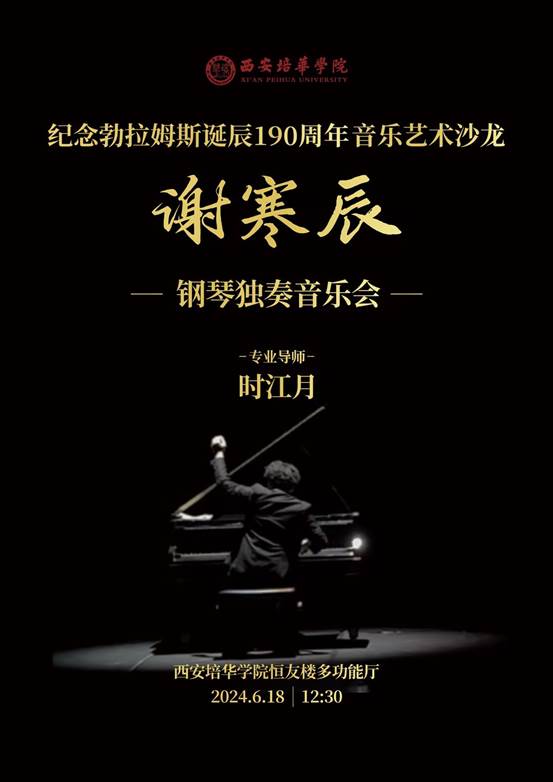 为落实美育浸润行动,丰富校园文化生活。2024年6月18日,由西安艺术教育学会与西安钢琴协会共同主办,西安培华学院艺术教育中心承办的“纪念勃拉姆斯诞辰190周年音乐艺术沙龙--谢寒辰钢琴独奏音乐会”在我校恒友楼多功能会议厅成功举行,音乐会由艺术教育中心刘荣弟主任主持。