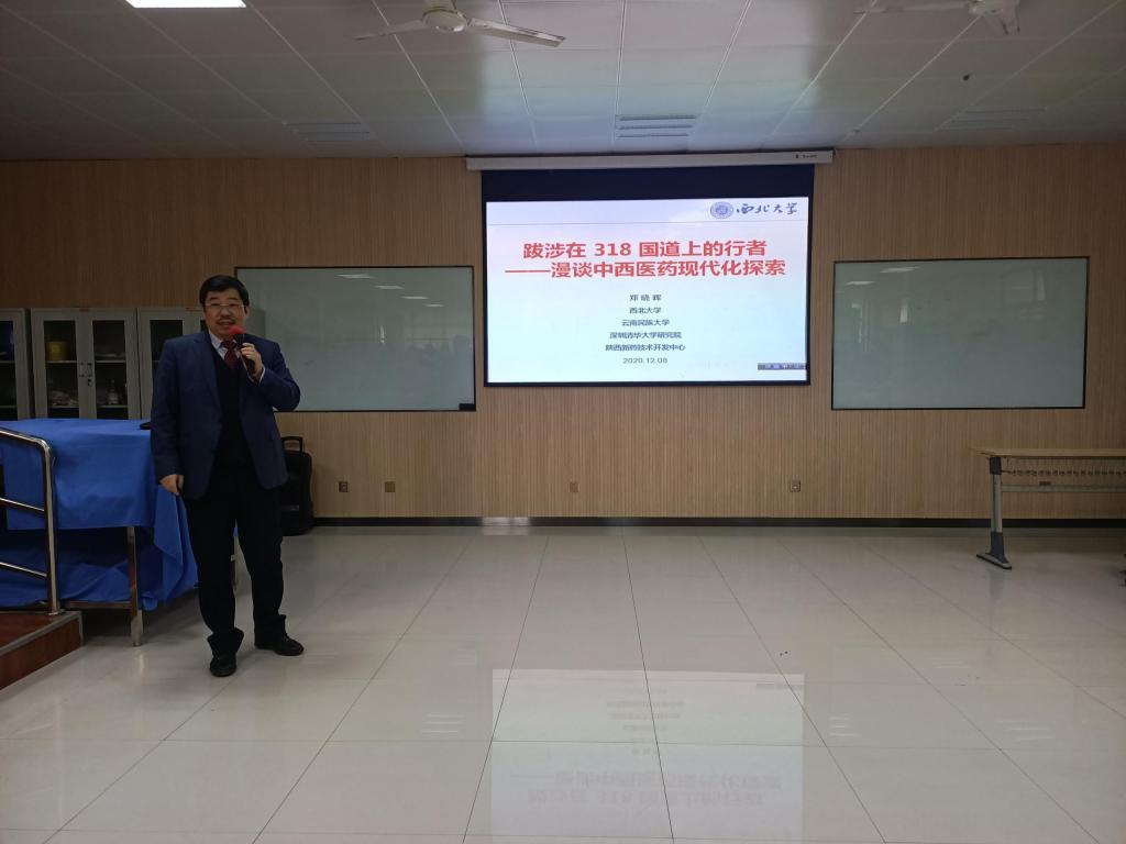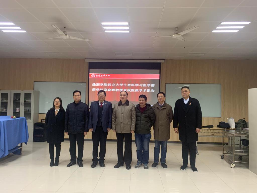 为提升药学系教师科研能力、促进专业学科更好的发展,加快药学一流专业建设及申硕发展进程,拓宽药学系师生对药学专业、创新药物新发展的视野,医学院药学系特邀西北大学生命科学与医学部药学院郑晓晖教授(高等学校专业设置与教学指导委员会药学类工作委员会,委员)于2020年12月8日下午16:00在医学院至善楼8227教室,进行“跋涉在318国道上的行者---漫谈中医药现代化探索”的学术报告会,参加本次讲座的有西安培华学院副校长兼医学院院长于国亮教授,医学院常务副院长扈国栋教授,医学院行政副院长王平安,药学系主任李元教授,学科带头人刘建利教授,以及药学系近150名师生聆听了此次讲座,讲座由药学系副主任方欢乐主持。