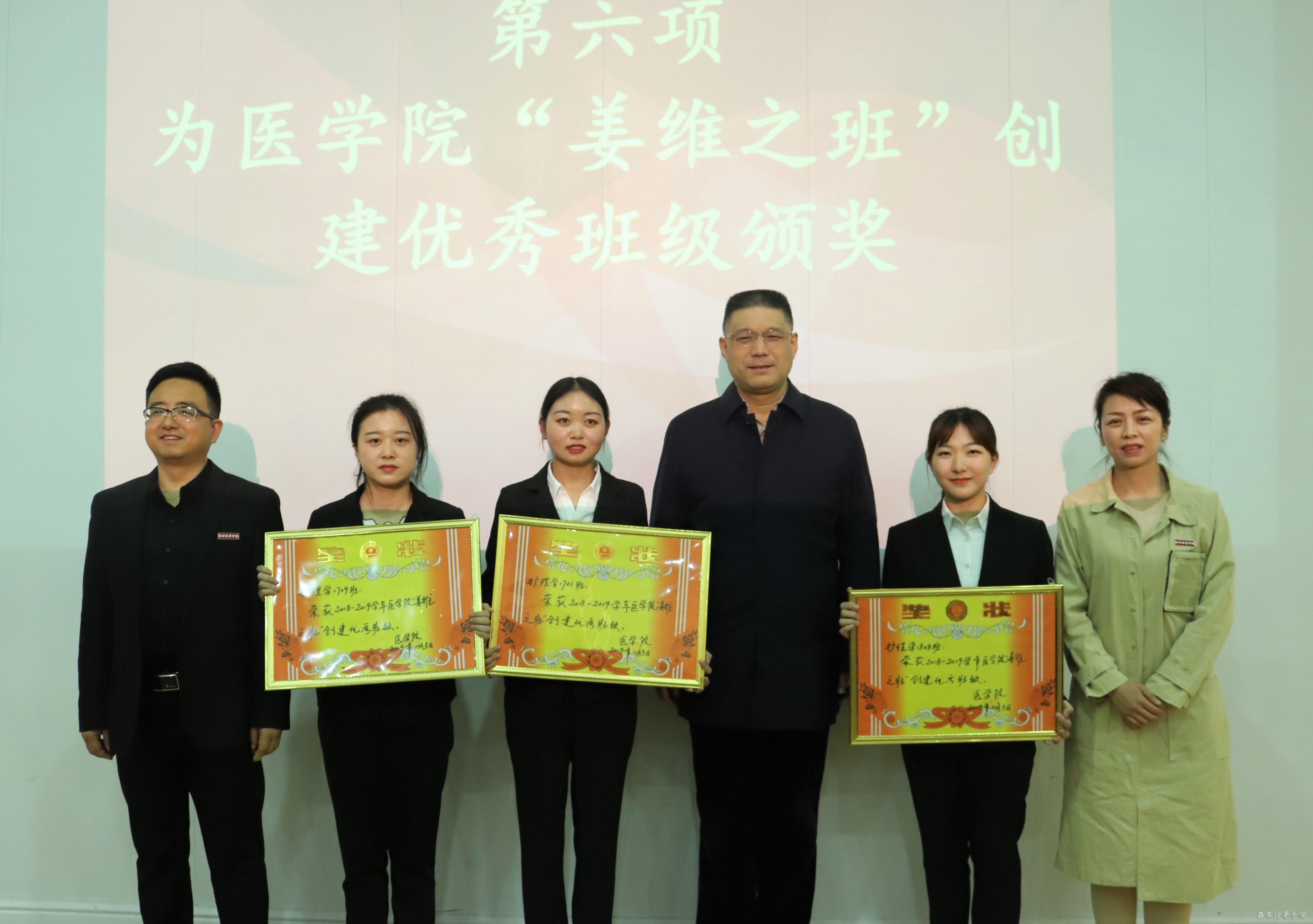 王平安院长,姚斌院长及王菊宁助理为2018-2019学年医学院创建“姜维之班”提名班级颁奖。