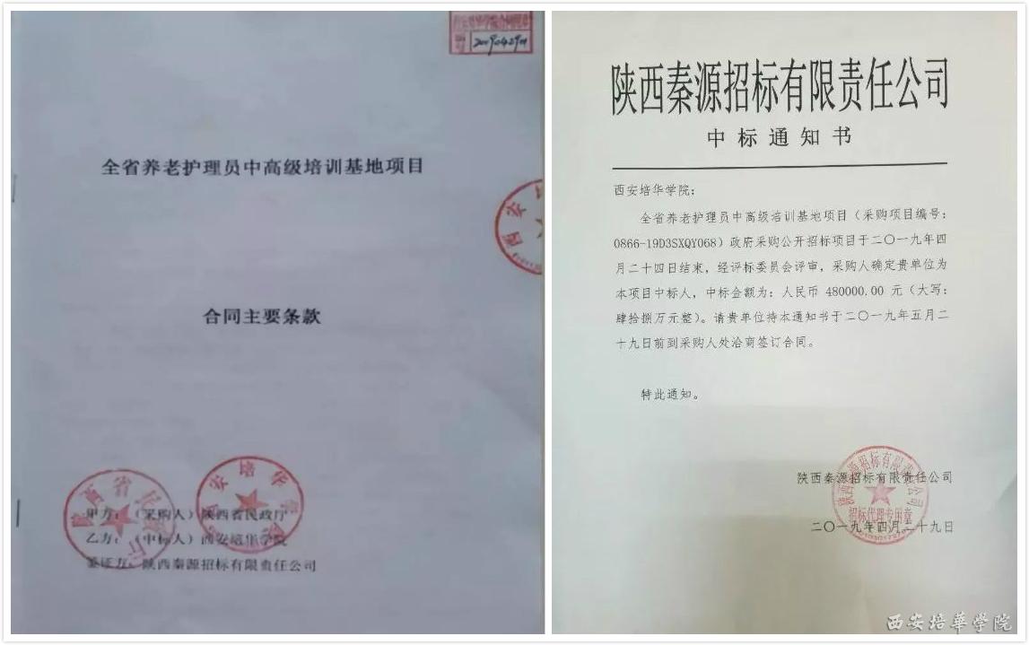 2019年4月24日陕西省民政厅根据《中华人民共和国政府采购法》、《国务院关于加强职业培训促进就业的意见》(国发〔2010〕36号)、《陕西省财政厅关于进一步规范政府采购活动的通知》规定举行了全省养老护理员中高级培训基地项目的招标活动,西安培华学院,经过前期多方努力筹备及自身优厚的办学条件,终于在8家竞标单位中脱颖而出,一举中标。并就此项目正式签订合同。