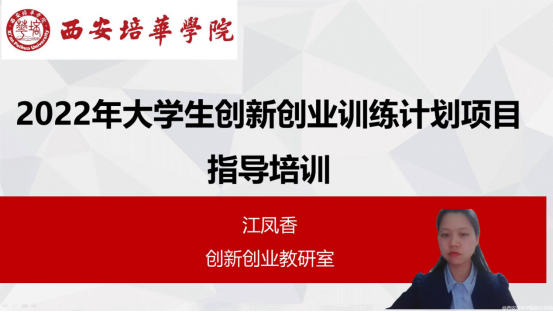 本次培训特邀学校创新创业优秀导师、创新创业教研室主任江凤香副教授主讲。她曾指导获得国家大创2项、省级大创2项;校级大创4项、互联网+大赛2项,获校级大创一等奖2项、二等奖10项、三等奖6项。