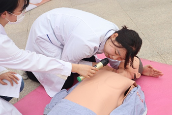 心肺复苏(CPR)是最基本的和最重要的抢救呼吸、心搏骤停者生命的医学方法,可以通过徒手、辅助设备及药物来实施,以维持人工循环、呼吸和纠正心律失常。由学生代表对现场的同学们进行急救教学,同学们近距离认真观察后,练习时得心应手。