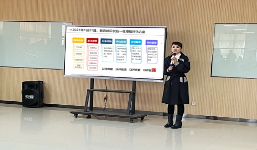 教学副院长王菊宁副教授着眼于学院视角、教师视角,围绕审核评估的启动背景、主要内容、实施要点三个方面做了专题辅导。启动背景版块她重点解读了新一轮审核评估的指导思想、评估方案、评估目的,强调了新一轮审核评估的“五个变化”,即导向变化、内涵变化、类型变化、方法变化、功能变化;主要内容版块她表示我校属于审核评估的第二类第3种,即首次参加审核评估的应用型高校,重点讲解了审核评估7个审核项目、27个要素、78个要点,强调了审核评估线上+线下、明察+暗访的评估方法;实施要点版块她就教师本科教学体验问卷调查、麦可思质量检测系统、课堂教学基本环节、评估学习手册等方面提出要求,强调全体教职工必须加强学习课堂教学相关文件精神。她讲到,审核评估是高校的“体检”,是常态,新一轮审核评估不是另起炉灶,而是上一轮审核评估的延续、改进与升级,要把迎接本科教育教学审核评估工作与学院内涵建设、人才培养、教学工作紧密结合,持续提升人才培养质量。