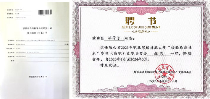 以第一发明人授权发明专利2项,软件著作权1项,主持申报陕西省教育厅自然科学专项课题2项,陕西省“十四五”规划教改课题1项,参与陕西省科技厅项目1项,教育厅项目2项;主持校级教科研项目5项,其中重点2项;完成横向课题2项;累计发表教科研论文10余篇,其中CSCD论文1篇,科技核心论文2篇;作为副主编参编教材1部;指导学生国家级大创项目1项,省级大创项目2项,校级大创2项,指导学生参加国家级第二届医药院校药学/中药学大学生创新创业大赛,荣获全国二等奖;指导学生参加第四届全国大学生基础医学实验设计大赛,获优秀奖等。