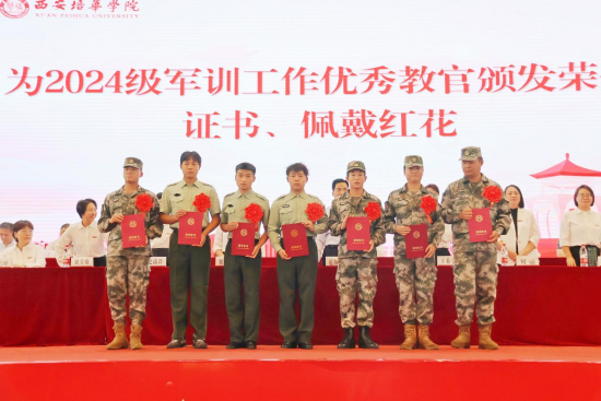 为2024级军训工作优秀教官颁发荣誉证书佩戴红花