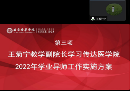 然后,王菊宁副院长学习传达《医学院2022年学业导师工作实施方案》;并强调学业导师要从学生的学业规划、职业规划、学习指导、“六率”提升、“姜维之”班创建、科研训练、创新创业能力培养、就业指导等方面进行全面指导;她希望学业导师能够切实履行自己的职责,从专业角度出发指导学生,落实好学业导师岗位职责。