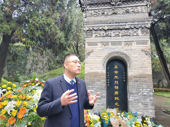 紧接着,在教工党员张少波的带领下,大家前往军墓献花。墓前摆满了鲜花,寄托着人们对烈士的怀念和敬意。所有同学庄严肃立,由两名青年学生代表献花,以此表达对杨虎城将军的敬意。