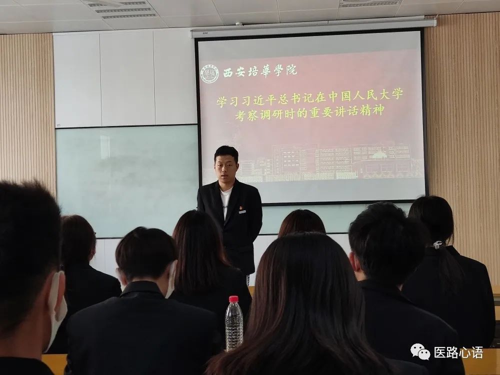 活动最后医学院学生会执行主席朱晓阳总结习近平总书记强调的是中国大学要扎根中国大地,传承红色基因,这契合新时代中国特色社会主义的发展方向,也符合新时代中国青年的价值要求。作为一名培华青年,肩负时代使命,应牢记习近平总书记殷切嘱托,牢记党的教诲,立志民族复兴,要深深地扎根在“大学”象牙塔的泥土里,从中不断汲取养分、茁壮成长,同时充分利用所学习的专业知识,把成果书写在祖国美丽的山河上、书写在矢志强国的使命担当之中,方能不负韶华,不负时代,不负人民。