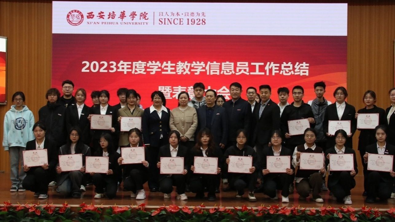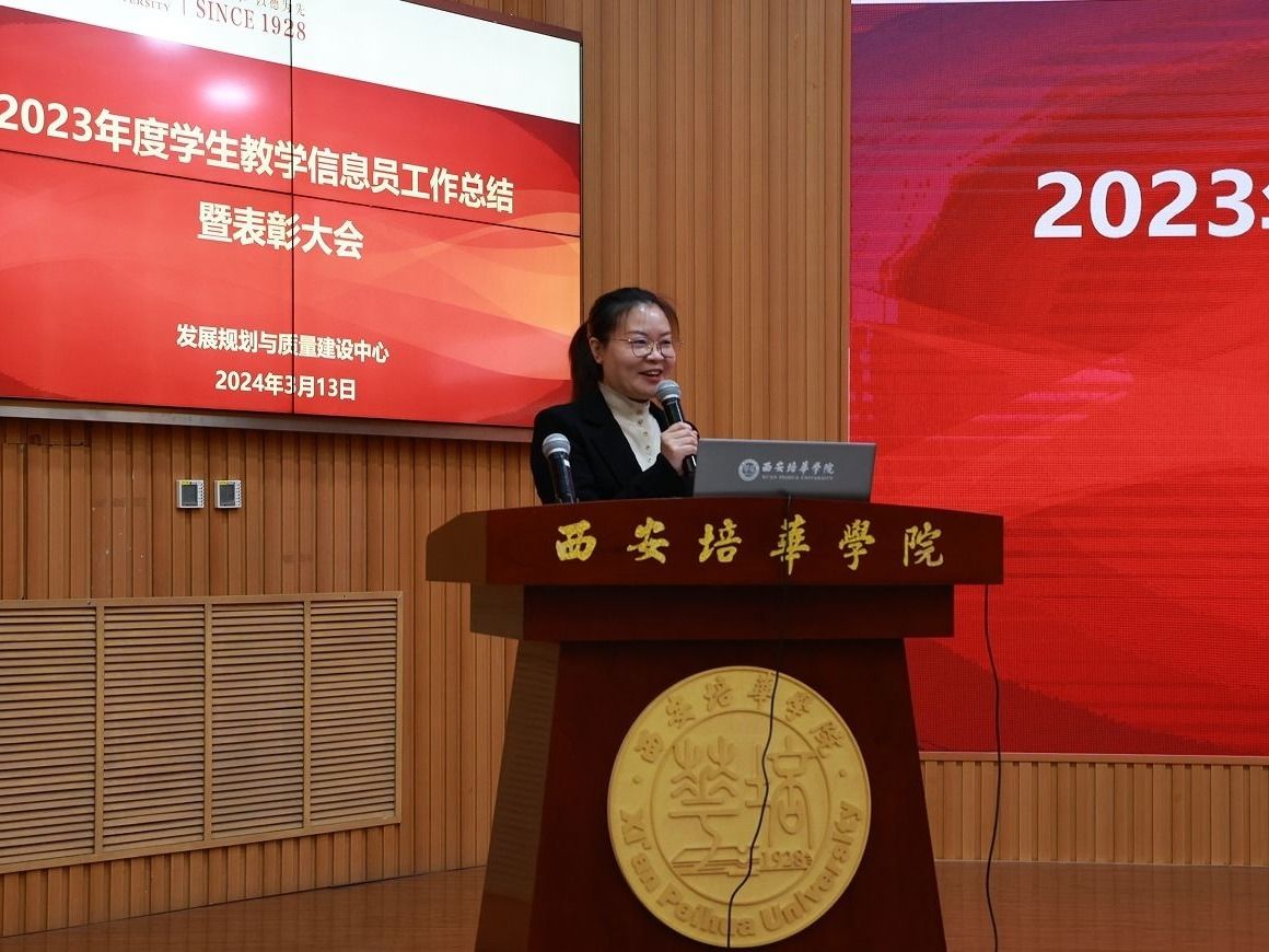发展规划与质量建设中心主任赵巍宣读了《西安培华学院关于表彰2023年度优秀学生教学信息员的通报》。在热烈的掌声中,常务副校长胡俊生、校长助理鲍伟为优秀学生教学信息员代表颁发了奖状。