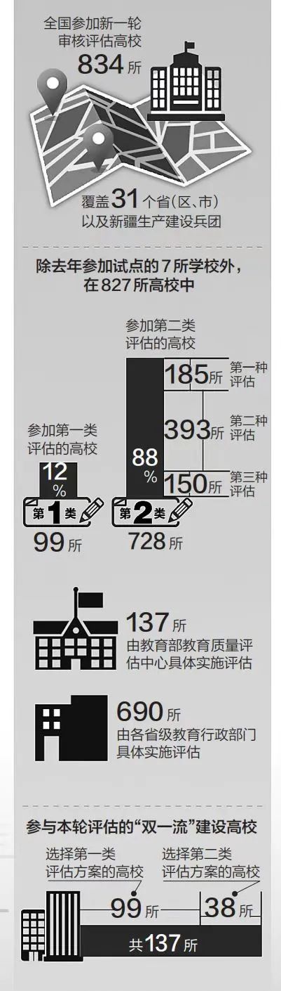 从规模上看,全国共有834所高校参加新一轮审核评估,覆盖了31个省(区、市)以及新疆生产建设兵团,反映了我国高等教育进入普及化阶段后量大面广的特征。
