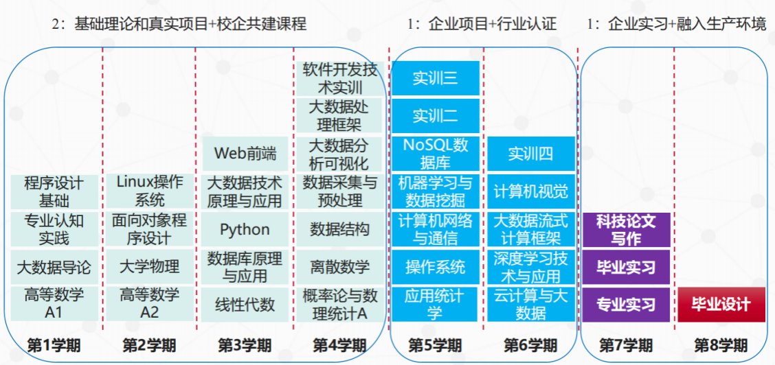 大数据导论、面向对象程序设计、Python程序设计、数据库原理与应用、数据结构、操作系统、应用统计学、大数据技术原理及应用、大数据处理框架、大数据流式计算引擎、数据采集与预处理、大数据分析与可视化、机器学习与数据挖掘、深度学习技术与应用、计算机视觉、人工智能导论、大数据项目综合实训、人工智能项目综合实训等。