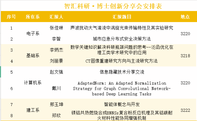 分享会汇聚了来自电子、基础科学、计算机、建筑工程等系的八位博士研究生,汇报课题兼具前沿性与实用性。从“声波扰动大气湍流中涡旋光束传输”的物理探索,到“城市应急分布式安全决策”的系统方法;从泛函优化、CT重建等基础理论与方法的深刻思考,到图神经网络归一化、信息隐藏、智能体开发、高性能复合材料等前沿技术的创新实践,充分展示了学院博士生群体扎实的科研功底与活跃的创新思维。各会场交流气氛热烈,激发了在场师生的广泛讨论与思想碰撞,切实起到了活跃学术氛围、启迪科研思路的作用。