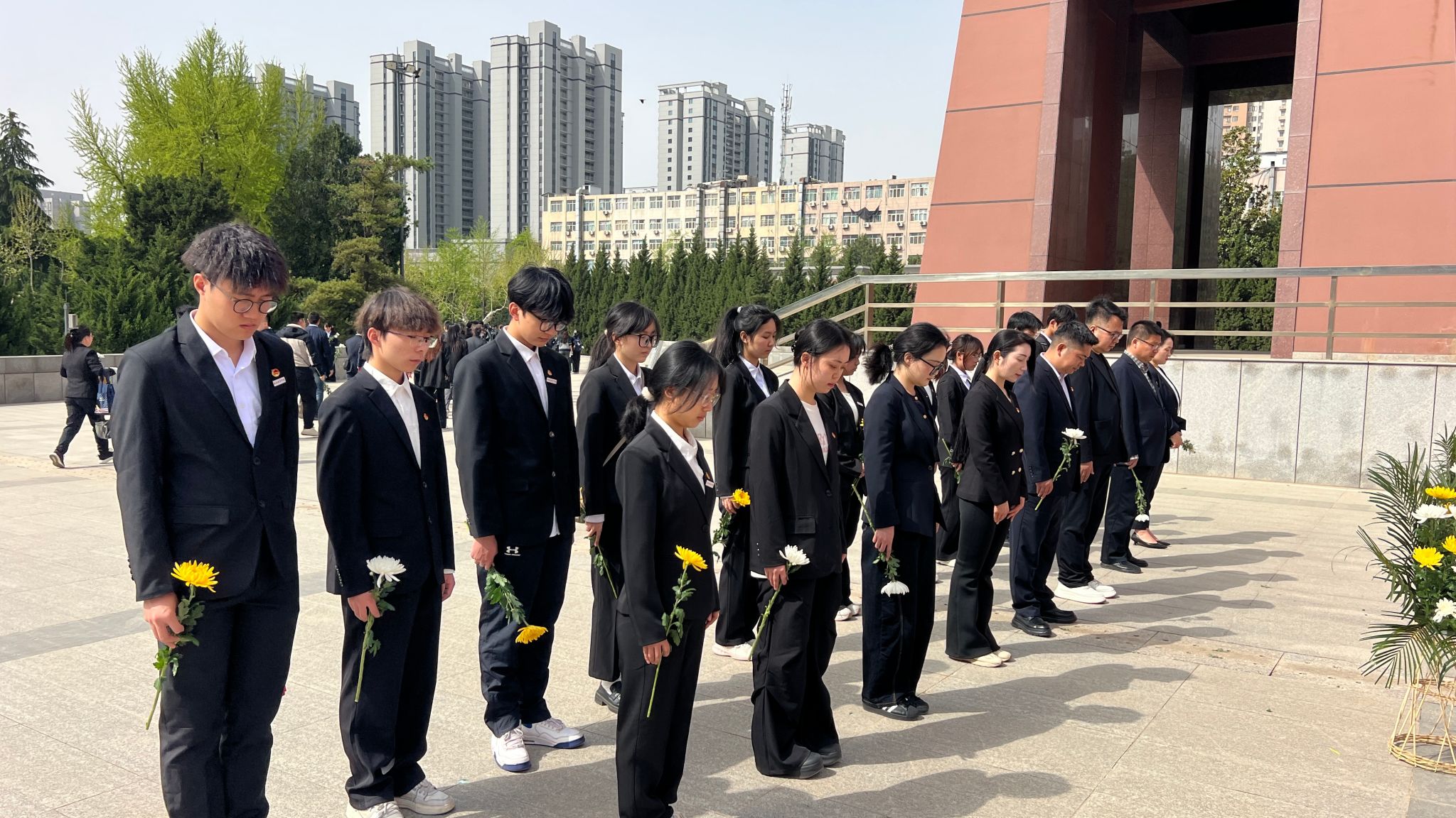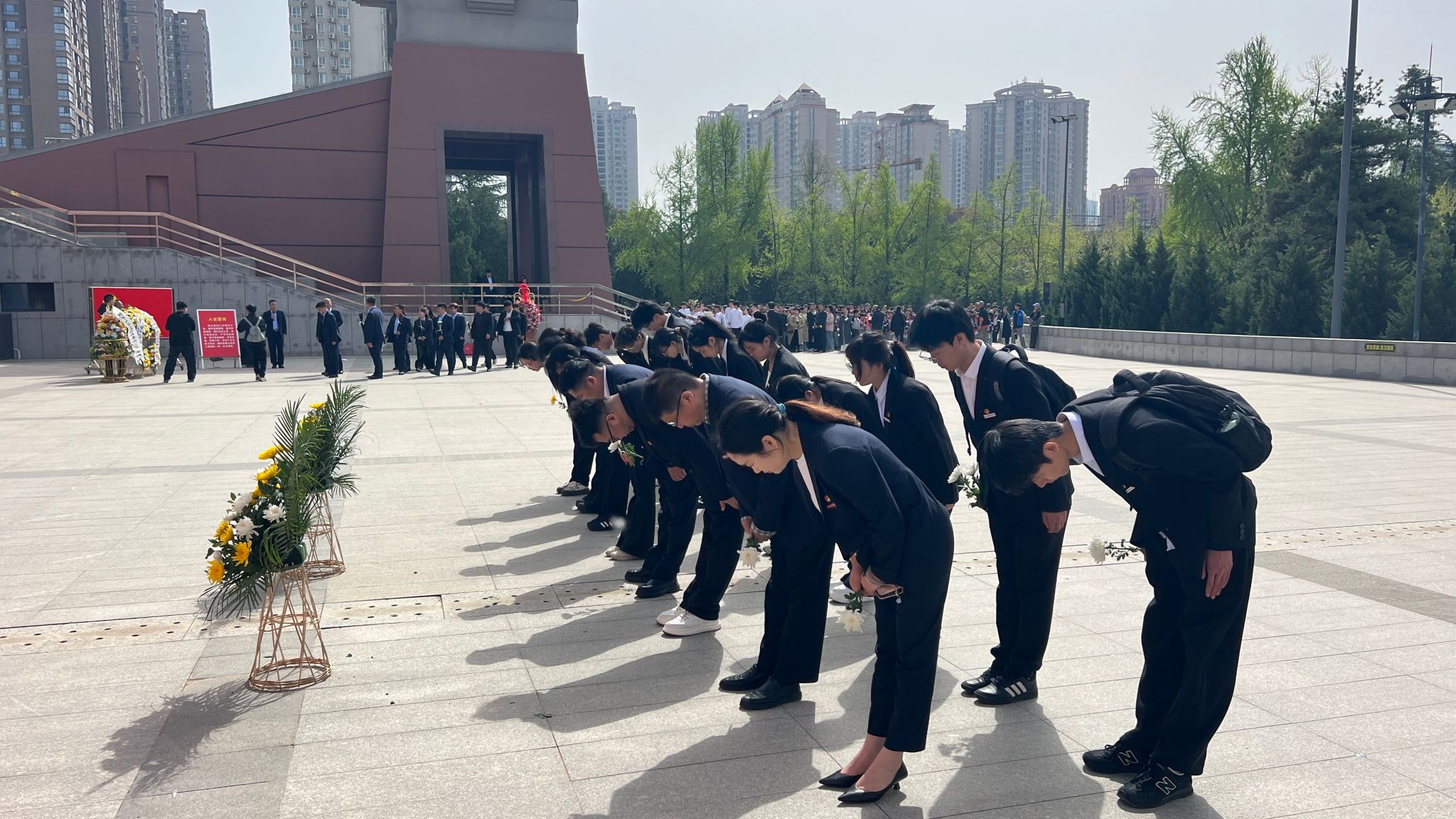 全体师生有序列队瞻仰丰碑,将手中的菊花轻轻摆放在碑前,擦拭碑文并瞻仰,进一步感受烈士们的伟大精神。