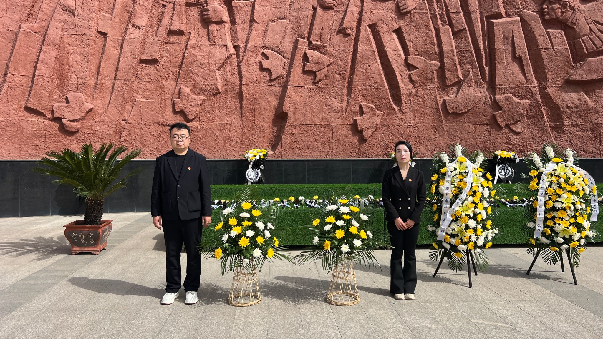教工第一党支部党员代表鱼翔、邵文欣向革命先烈敬献花篮
