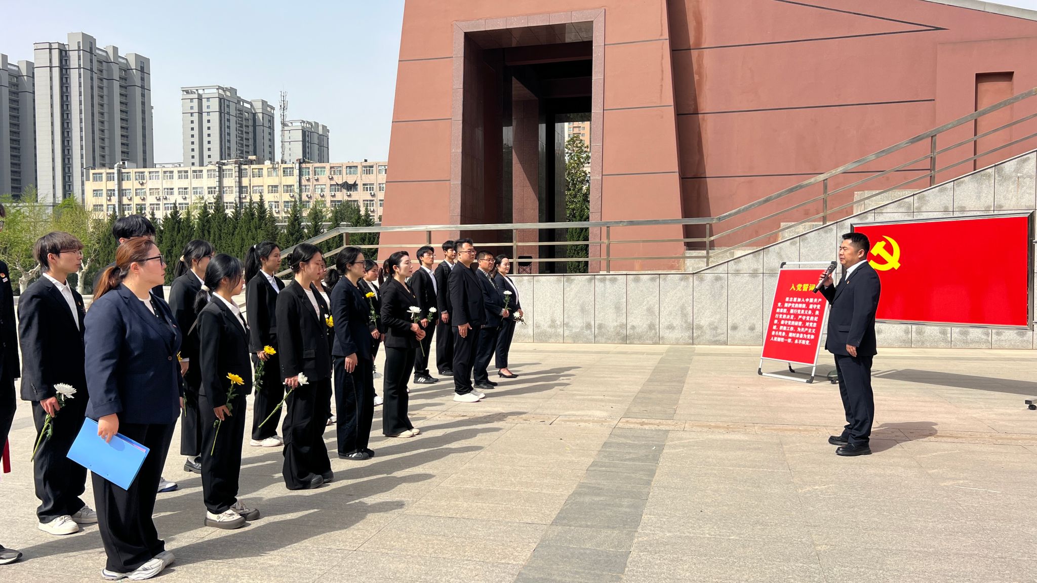 学生第二党支部书记杨桂锋带领全体党员面向党旗,高举右拳,重温入党誓词。铿锵誓言响彻广场,唤醒党员初心使命,强化党性修养与责任意识,进一步筑牢信仰之基、凝聚奋进力量。