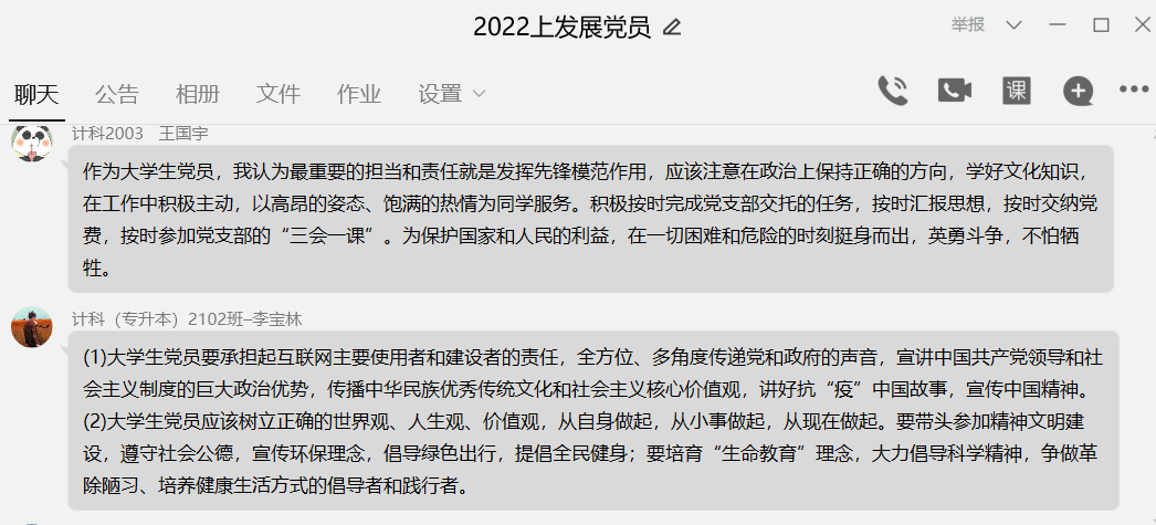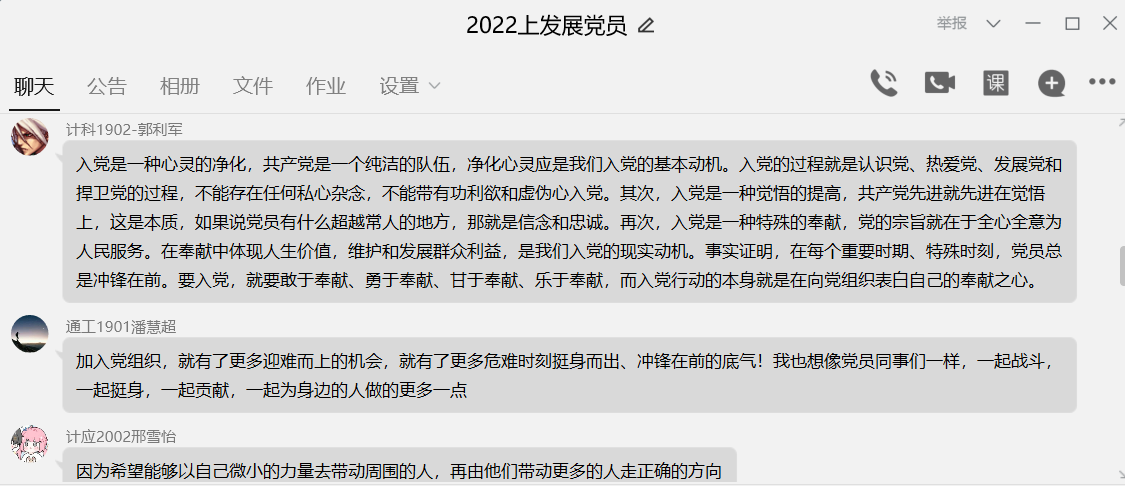 观影后,本期党员发展对象在QQ群聊中围绕“我为什么要入党”、“大学生党员的责任与担当”这两个问题进行交流与讨论,发表自己的看法与感想。