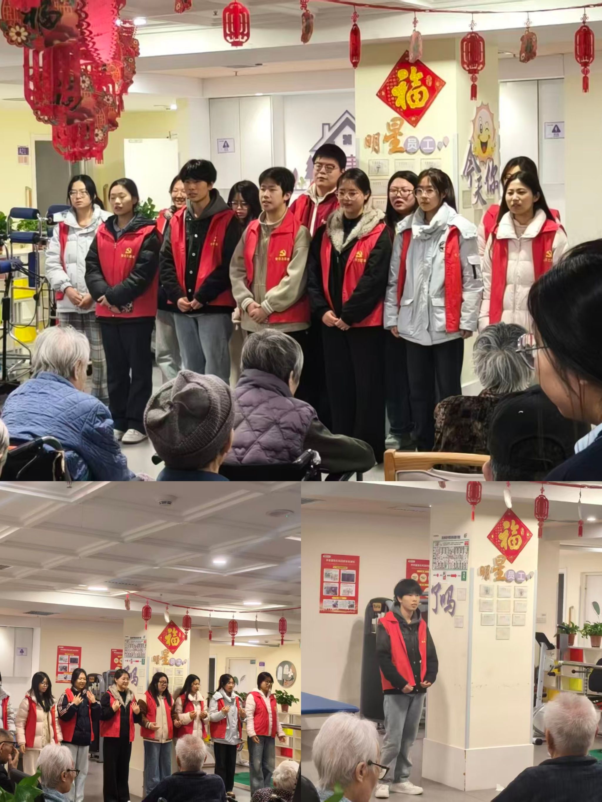 在活动大厅里,志愿者们为老人们带来了一场充满活力的表演。大家身着统一的志愿服,用嘹亮的歌声和真挚的情感,为老人们送上祝福,赢得了阵阵掌声,老人们脸上洋溢着幸福的笑容,有的跟着节奏轻轻拍手,有的闭目聆听,沉浸在这温馨的氛围中。表演结束后,志愿者们围坐在老人身边,与老人们促膝长谈,倾听他们讲述过去的故事,分享生活中的点滴。一句句贴心的问候,一个个温暖的笑容,让老人们的脸上绽放出光彩。